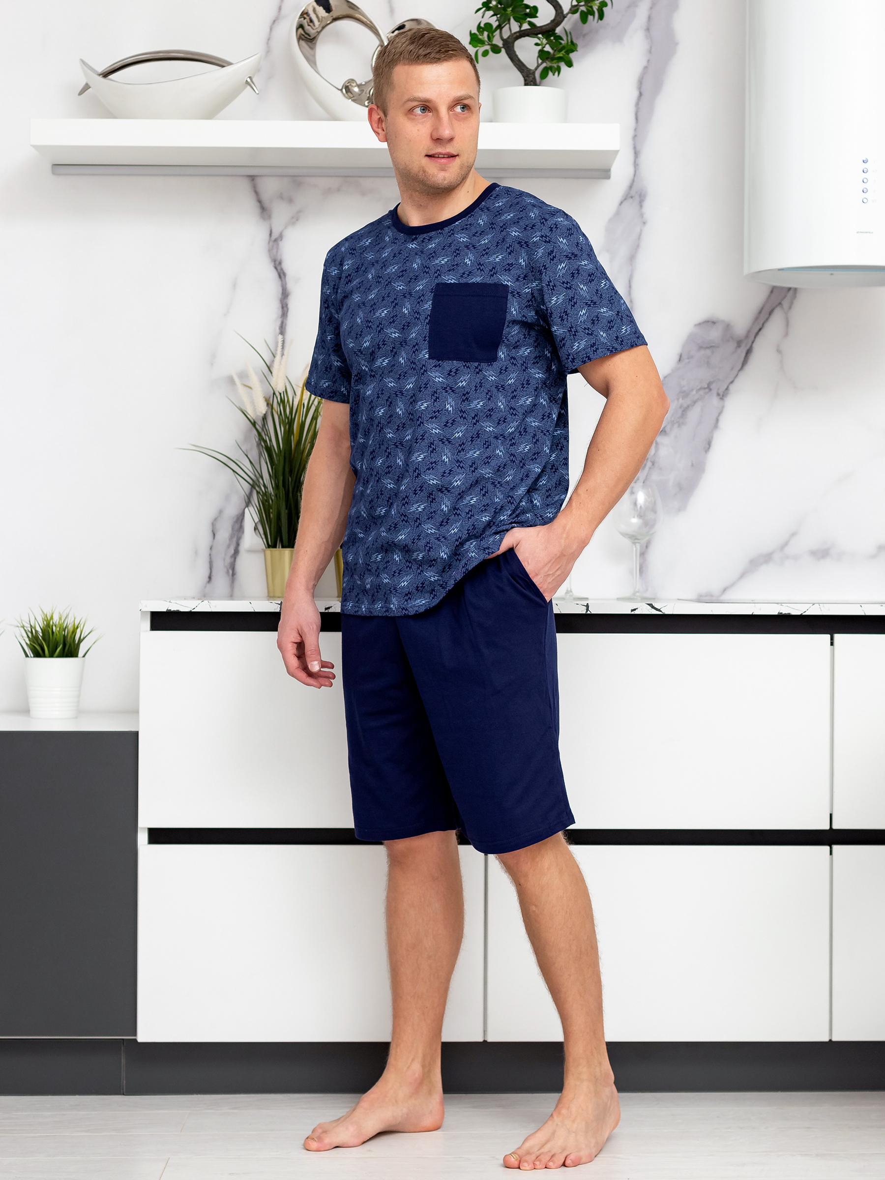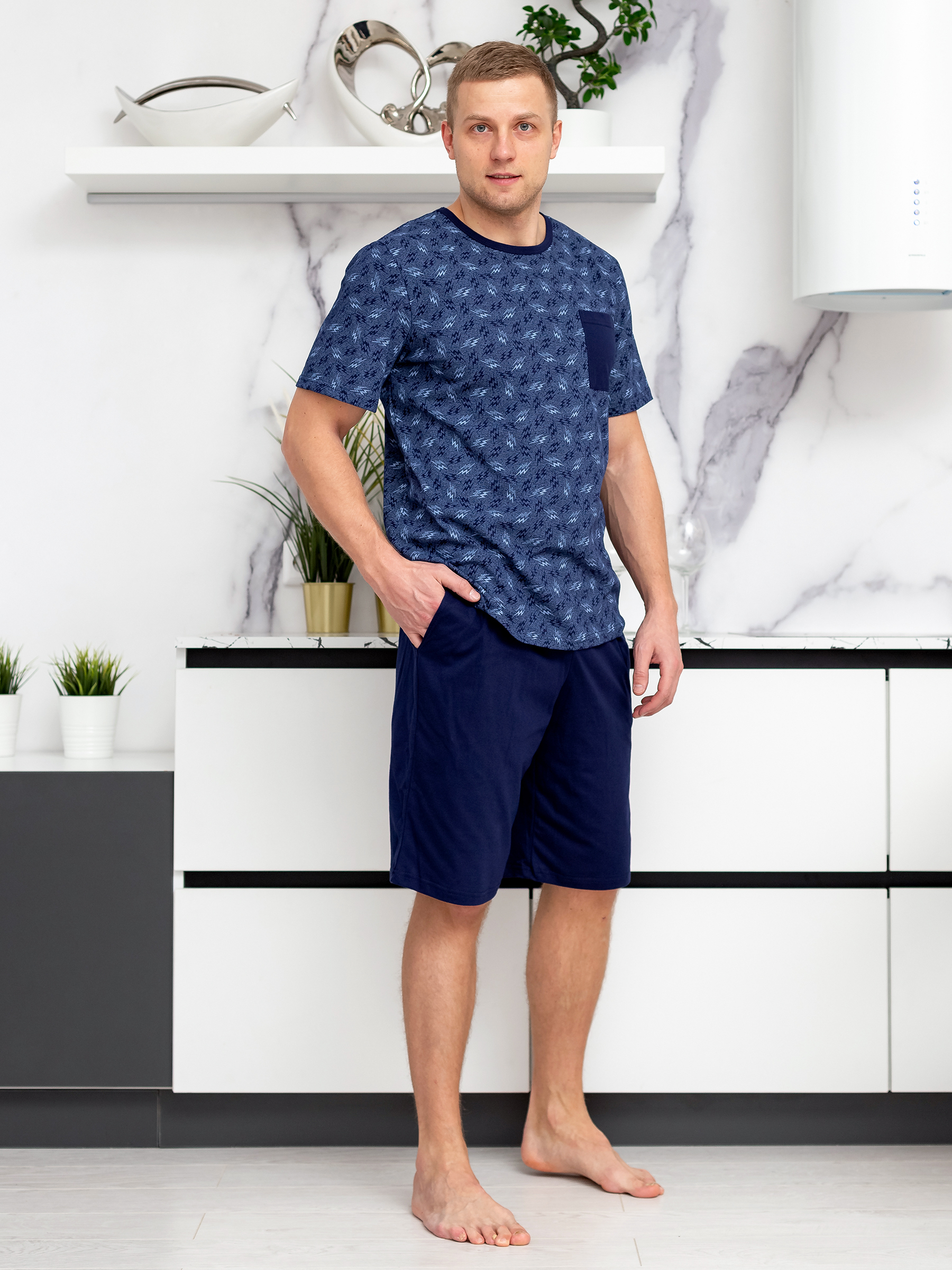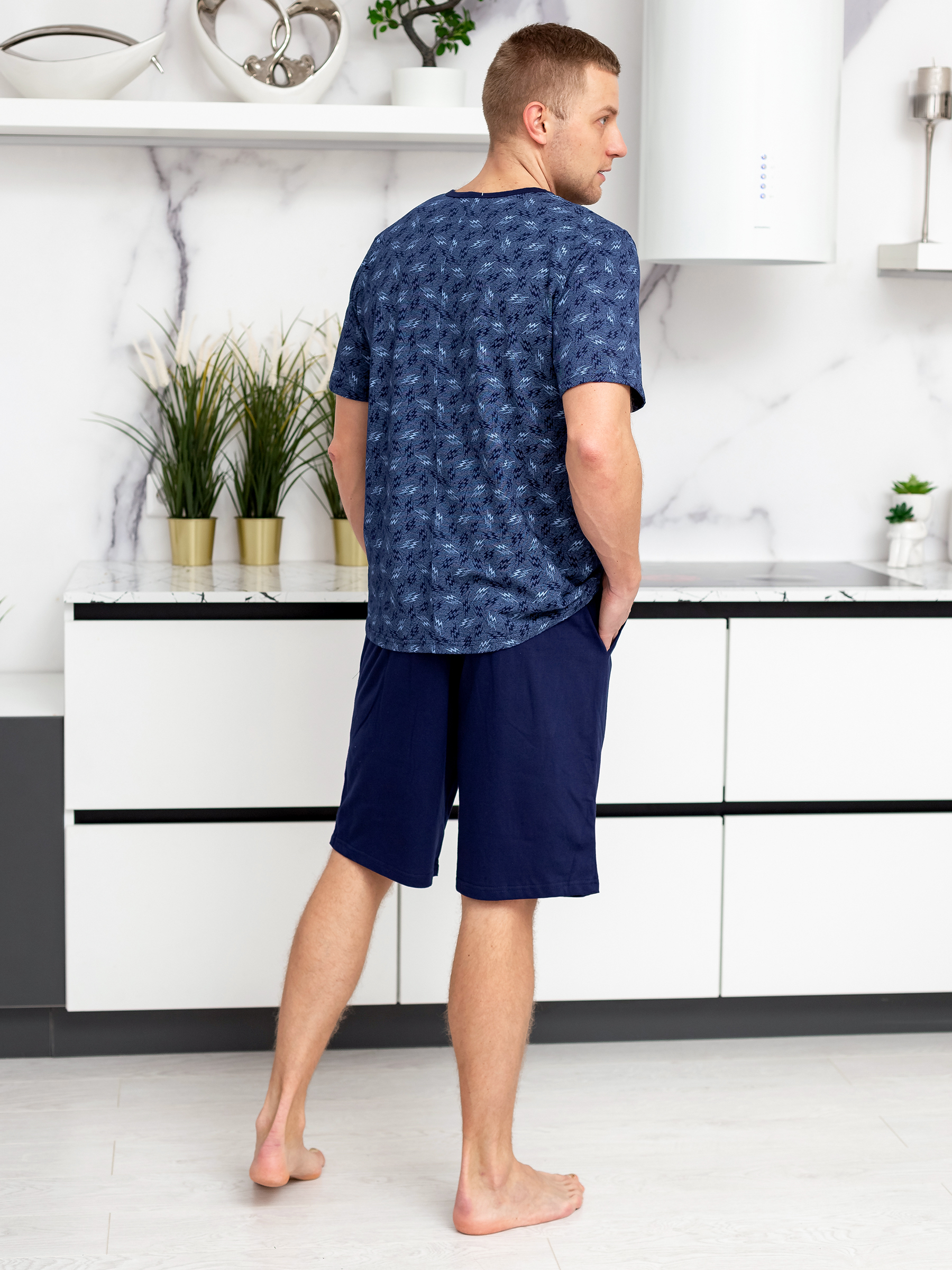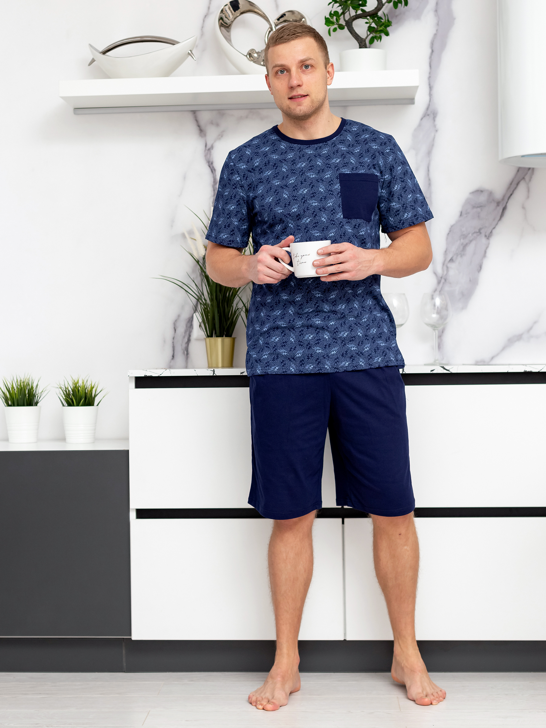 Покрой изделия обеспечивает свободу движения и подойдет на любую фигуру, а благодаря натуральному хлопковому материалу костюм для дома мужской с принтом прекрасно пропускает воздух и очень приятен к телу, что и нужно для домашней одежды.